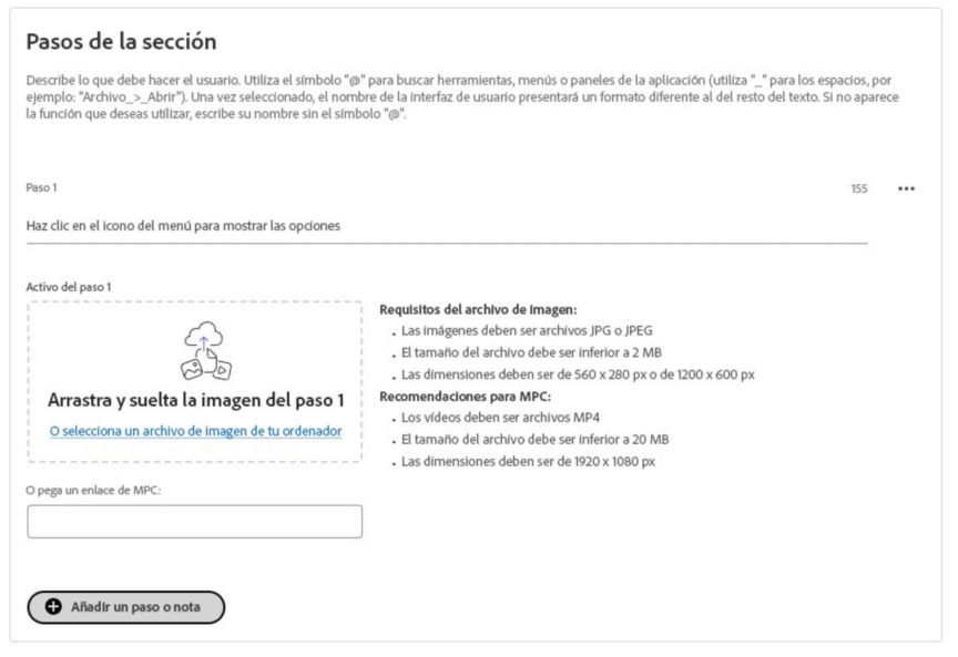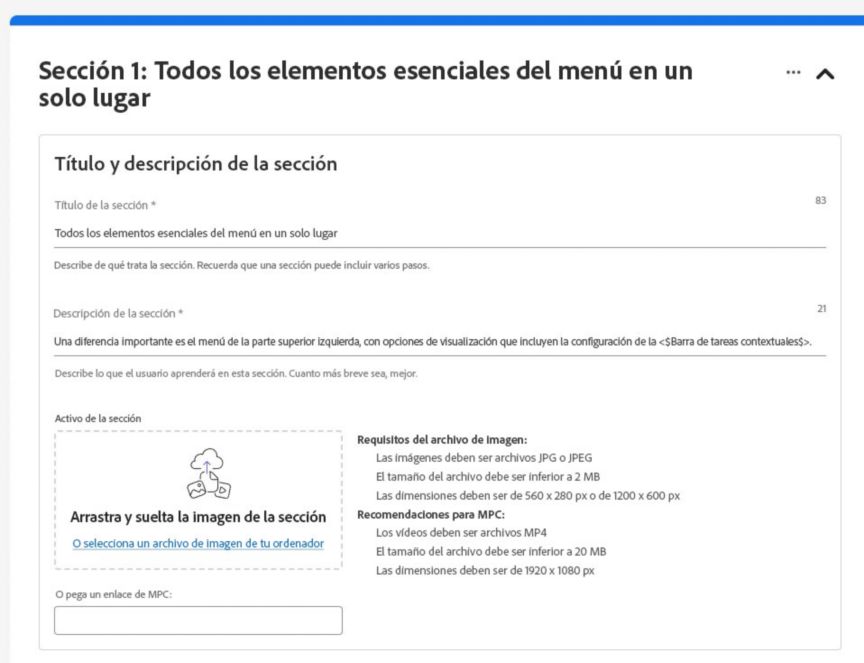 Para aprender a crear secciones y pasos, haz clic en Creación de un tutorial > Tutoriales.