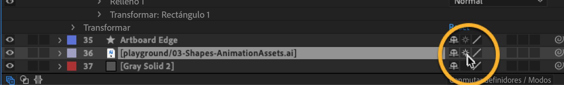 - Asegúrate de que la columna Rasterizar de forma continua está seleccionada para cualquier contenido Ai importado en Ae. Esto hace que el contenido vectorial aparezca nítido en los MP4 finales. (Si no ves este ajuste, haz clic en el botón "Interruptores de palanca/Modos" en la parte inferior de la ventana).