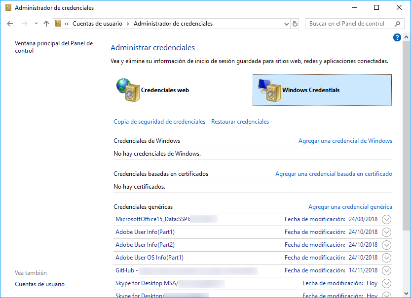 Elija Inicio > Panel de control > Cuentas de usuario > Administrador de credenciales.