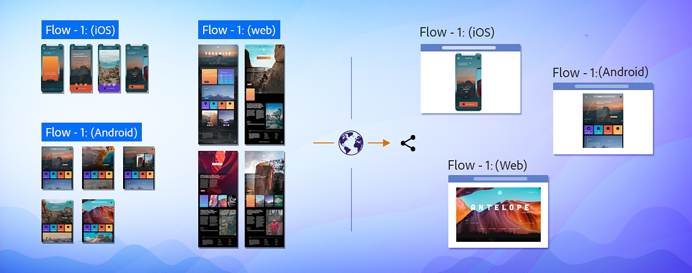 Los diseñadores pueden crear y compartir ahora múltiples flujos de interacciones dentro de un único documento XD. Puede configurar diferentes mesas de trabajo principales para cada flujo de interacción en un documento y compartirlas con los responsables de departamento mediante vínculos de uso compartido.