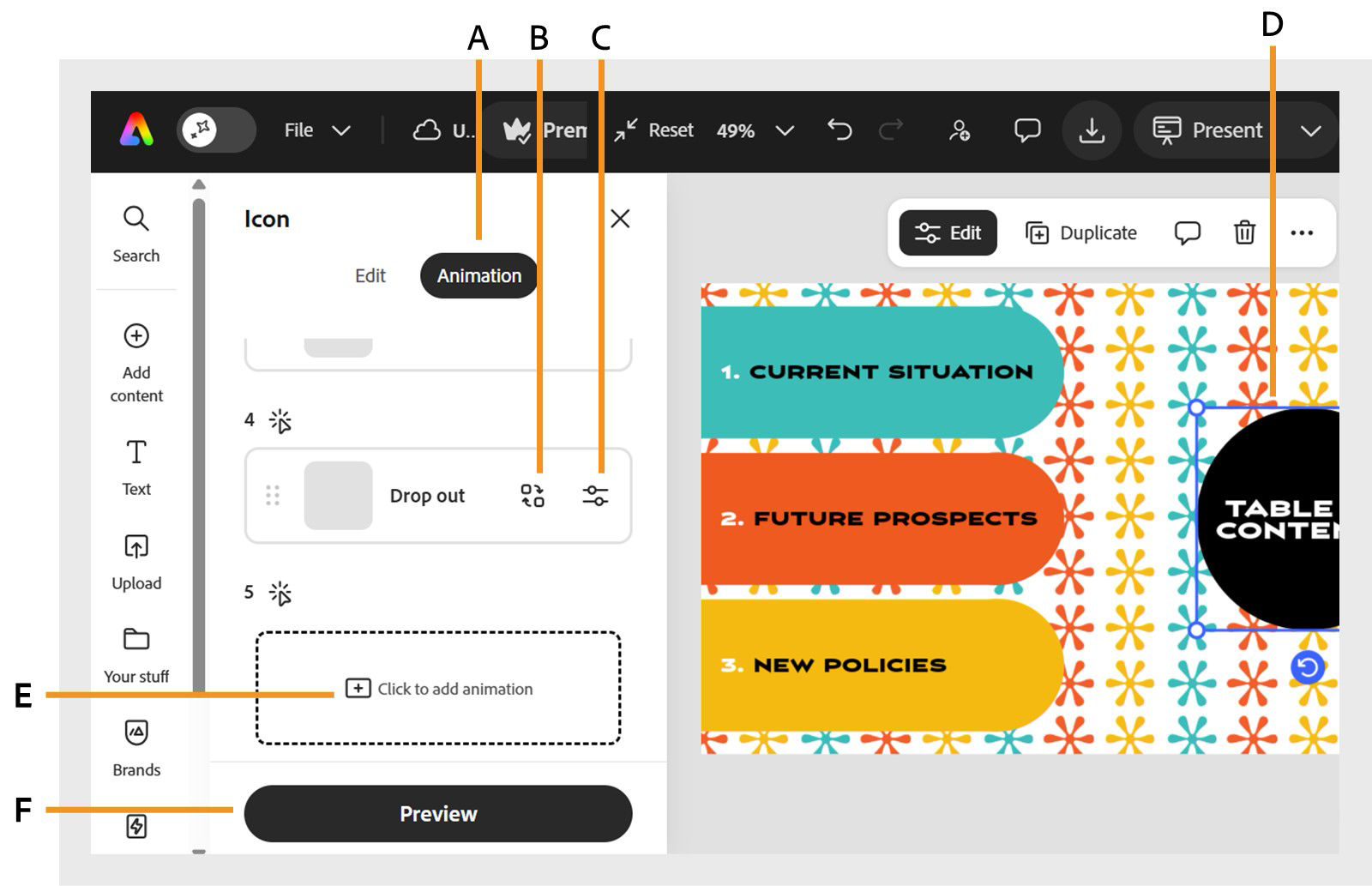 A: Animation panel displaying the Click order sequence B: Settings icon to edit the animation effects C: Properties icon to add delay duration and other settings D: Select an object on the slide to add animations E: Click to add animations F: Preview button to see the playback order.