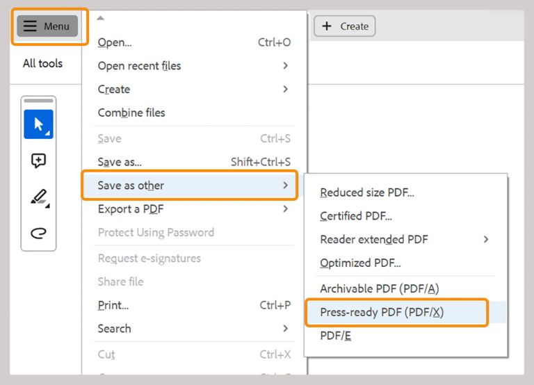 Avaa PDF Acrobatissa ja valitse hampurilaisvalikko (Windows) tai Tiedosto-valikko (macOS) > Tallenna muussa muodossa > Tulostusvalmis PDF (PDF/X).