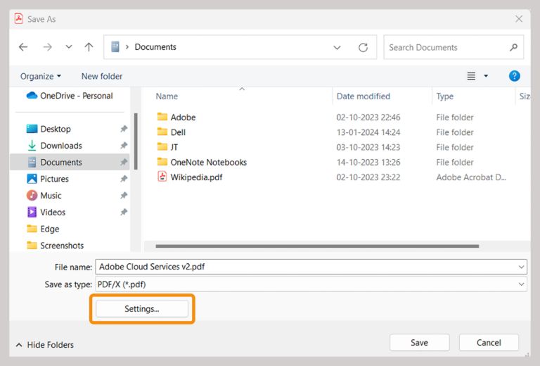 Valitse tiedoston Tallenna nimellä -valintaikkunassa Asetukset.