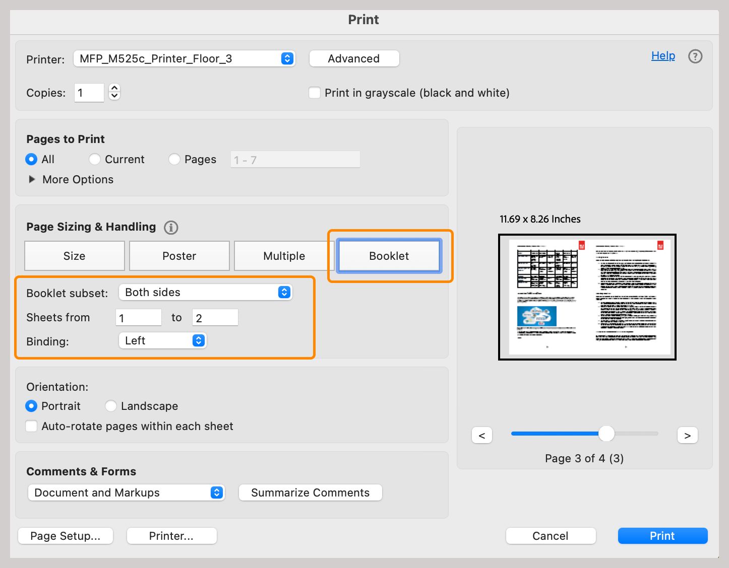 Monisivuisen asiakirjan tulostaminen vihkona on mahdollista Acrobatilla tai Readerilla, jotka järjestävät kaksi sivua arkille. Kun olet lajitellut, taittanut ja nitonut kaksipuoliset arkit, saat vihkon, jossa sivut ovat oikeassa järjestyksessä.