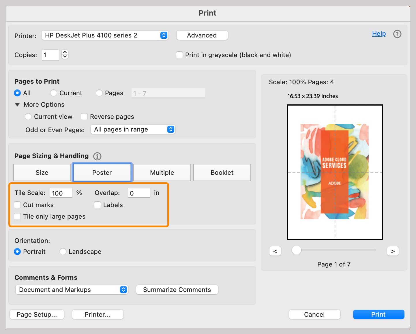 Valitse Juliste Tulosta-valintaikkunan Sivun koko ja käsittely -osiossa.