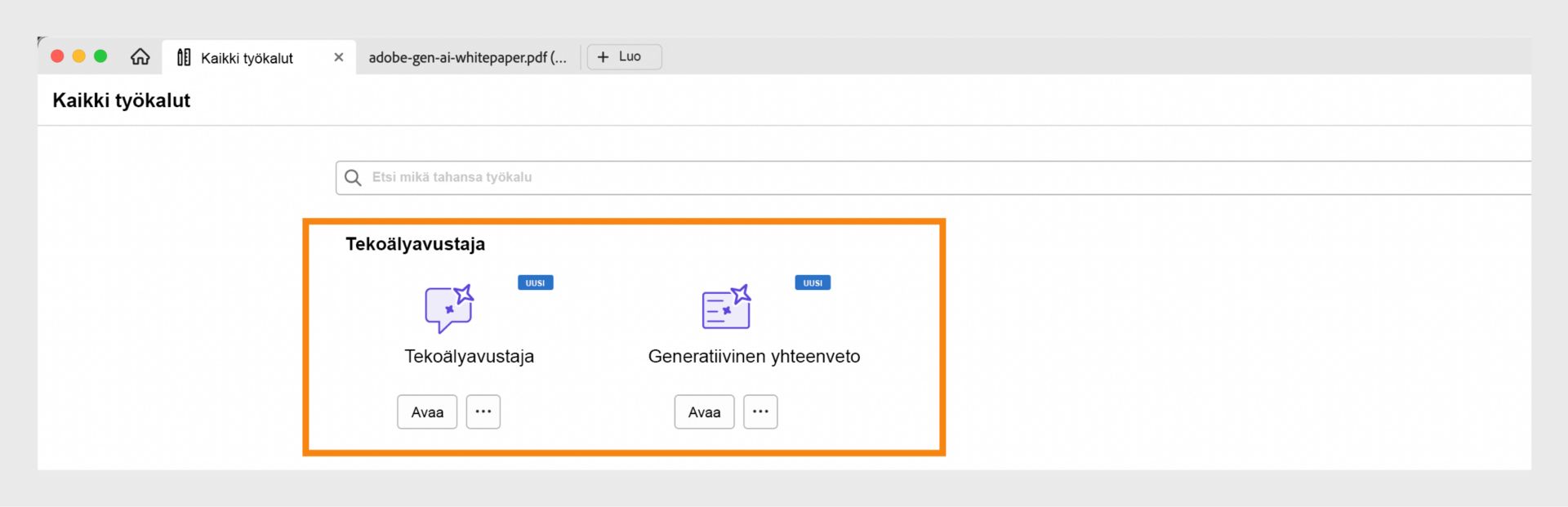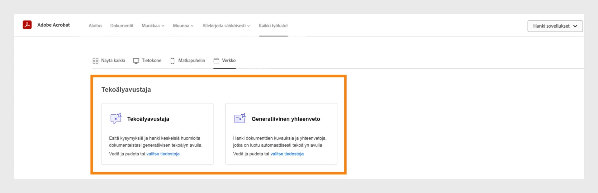 Valitse vaihtoehtoisesti Acrobatin aloitussivulta Kaikkityökalut ja valitse sitten Tekoälyavustaja tai Generatiivinen yhteenveto -työkalu.