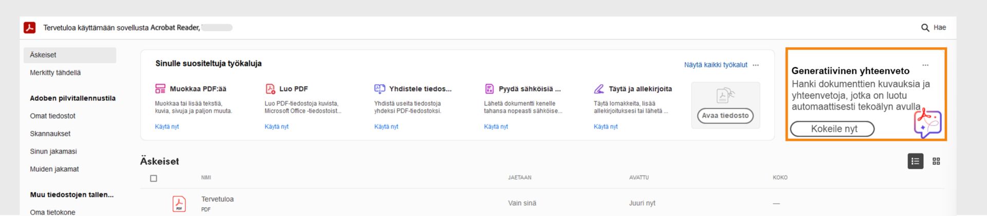 Käytä generatiivisia tekoälyominaisuuksia Acrobat Readerissa