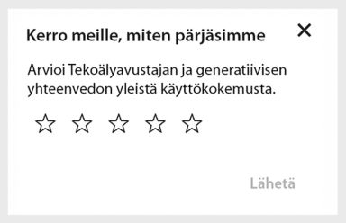 Kun olet käyttänyt tekoälyominaisuuksia vähintään neljä kertaa, Acrobat tai Acrobat Reader kehottaa sinua arvioimaan kokonaiskokemustasi tekoälyavustaja- ja generatiivinen yhteenveto -ominaisuuksista. Valitse tähtiluokitus ja lähetä se. Pienoisohjelma näyttää tekstikentän palautteen kirjoittamiseen, jos arviosi on kaksi tai vähemmän.