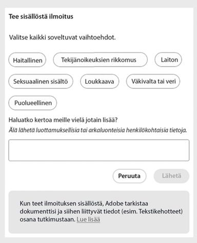 Voit myös tehdä ilmoituksen sisällöstä, joka on mielestäsi sopimatonta. Adobe käy läpi huolenaiheesi ja ryhtyy toimiin tarvittaessa.