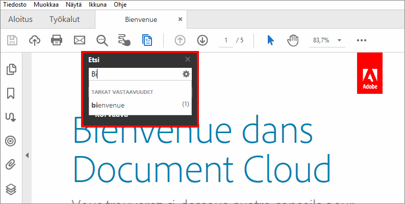 Avaa Acrobat työpöydältä (ei Web-selaimesta). Avaa Etsi-työkalurivi painamalla Ctrl + F (Windows) ja painamalla Command+F (macOS).
