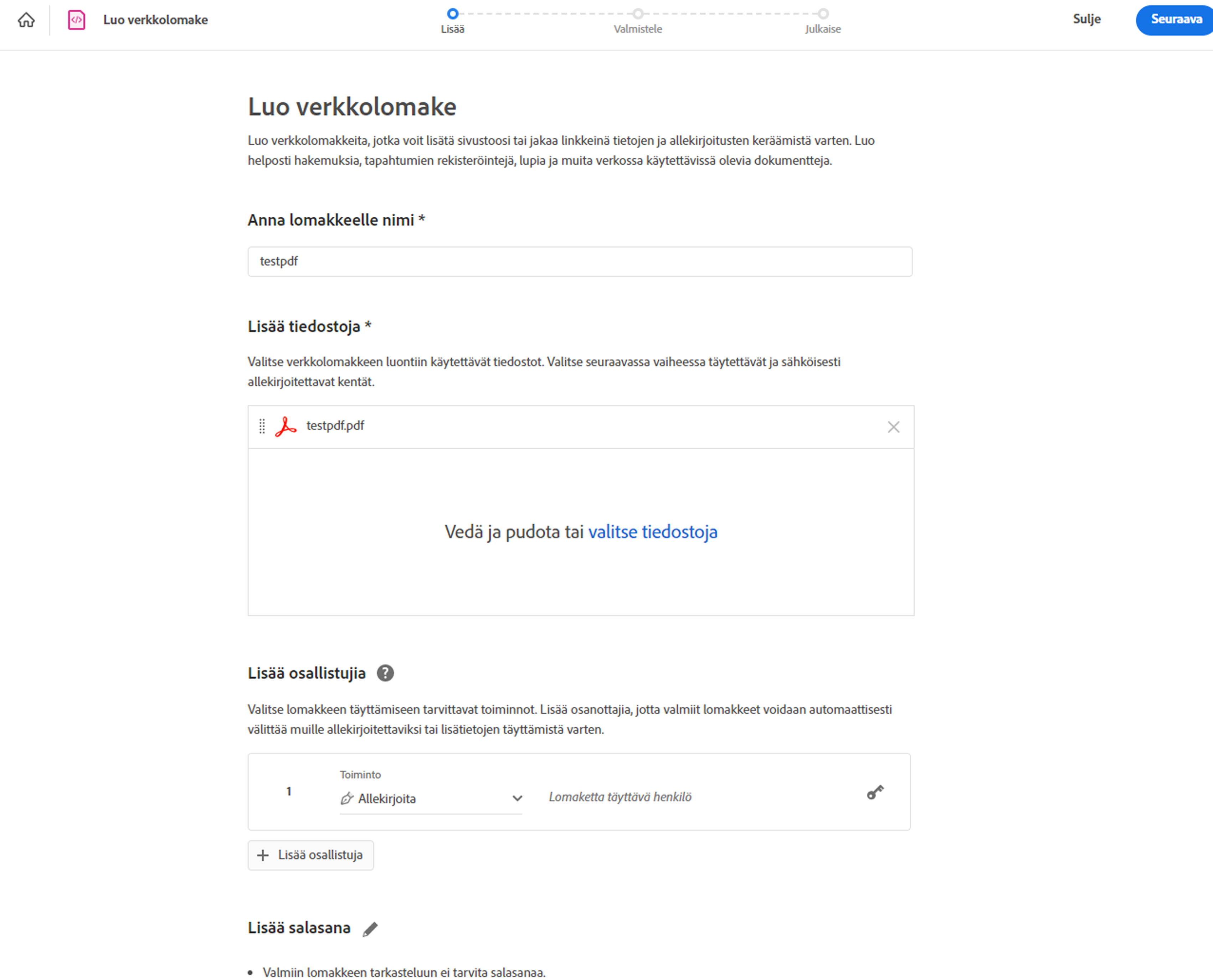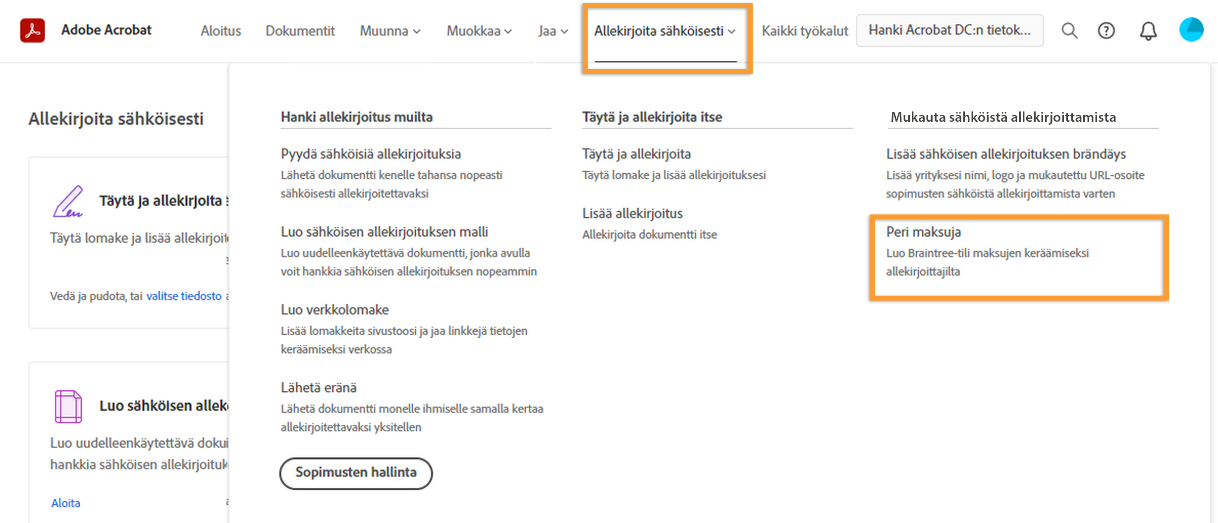 Verkkopalvelut sisältävä Adobe Acrobat Pro on monipuolinen PDF-ratkaisu, jolla voit käsitellä tärkeimpiä dokumenttejasi tietokoneella, verkossa ja mobiililaitteilla. Päivitä Acrobat-tietokone- ja -mobiilisovelluksesi tai kirjaudu Acrobatin verkkopalveluun, jossa voit kokeilla uusia toimintoja ja parannuksia.