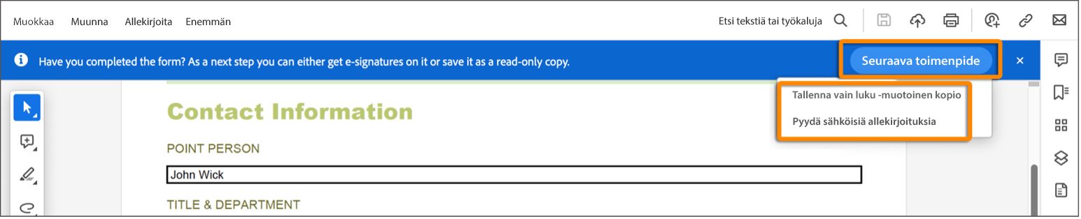 Kun tallennat allekirjoitetun lomakkeen, Acrobat näyttää näytön yläosassa sinisen viestipalkin, jossa sinulta kysytään, minkä toiminnon haluat suorittaa lomakkeelle seuraavaksi: Tallenna vain luku -muotoinen kopio vai Pyydä sähköisiä allekirjoituksia.
