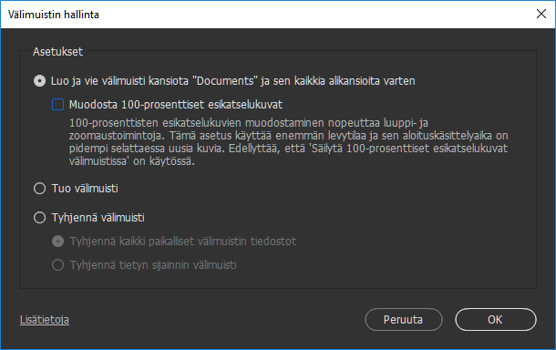 Huomautus: kunkin kansion käyttöoikeustaso otetaan huomioon välimuistin luonnin yhteydessä. Vientitoiminto luo sisäisesti indeksit, miniatyyrit ja esikatselut ja tallentaa vientiversion tiedot jaetun välimuistin kansioon. Bridge vie myös tiedostojen metatiedot.