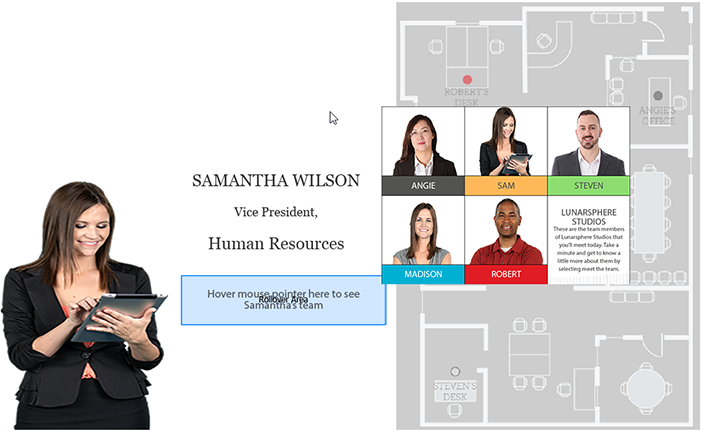 If the user clicks the button with the caption Where is Sam's desk, an effect is triggered on the blue highlight over Sam's desk on the floor plan.