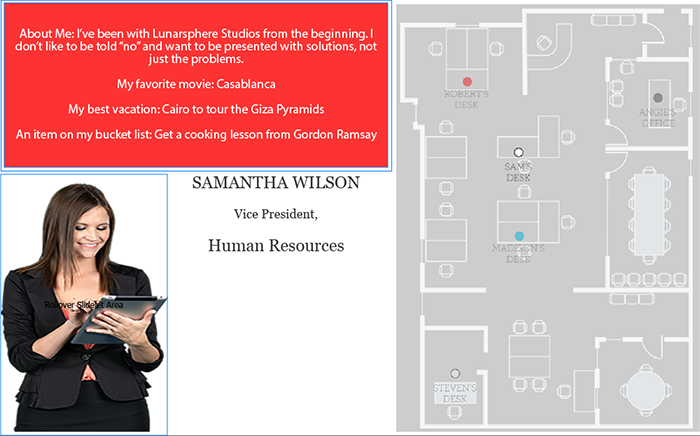 Let's add a rollover slidelet to display more details about Samantha when users hover over her image on the following slide: