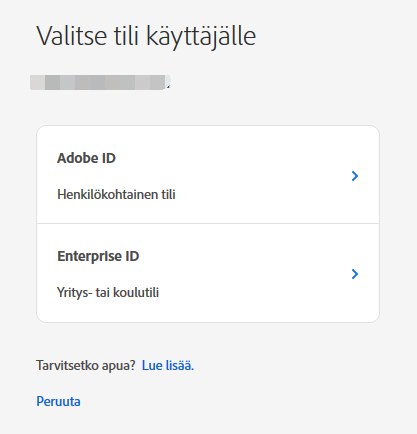 - Jos olet kirjautunut Enterprise ID ‑tiliisi sähköpostiosoitteella, joka on liitetty myös Adobe ID ‑tiliin, kirjaudu Adobe ID ‑tililtä ulos ja sitten takaisin sisään.