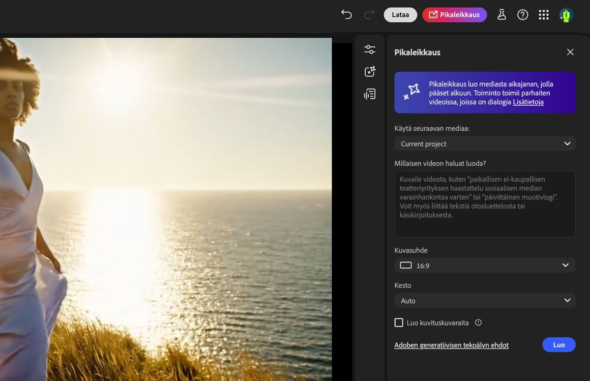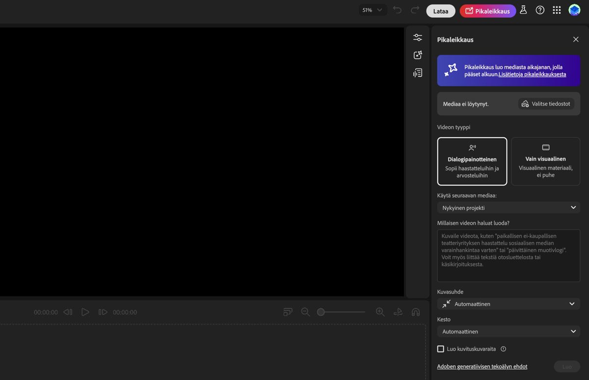 Pikaleikkaus on Fireflyn videoeditorin (beta) toiminto, jolla voit nopeasti koota videoleikkeistä, kuvista ja äänitiedostoista yhtenäisen alustavan kokonaisuuden. Palveluun lataamiesi tiedostojen ja tekoälyn avulla luot videoluonnoksen, jota voit sitten muokata ja hienosäätää haluamallasi tavalla.