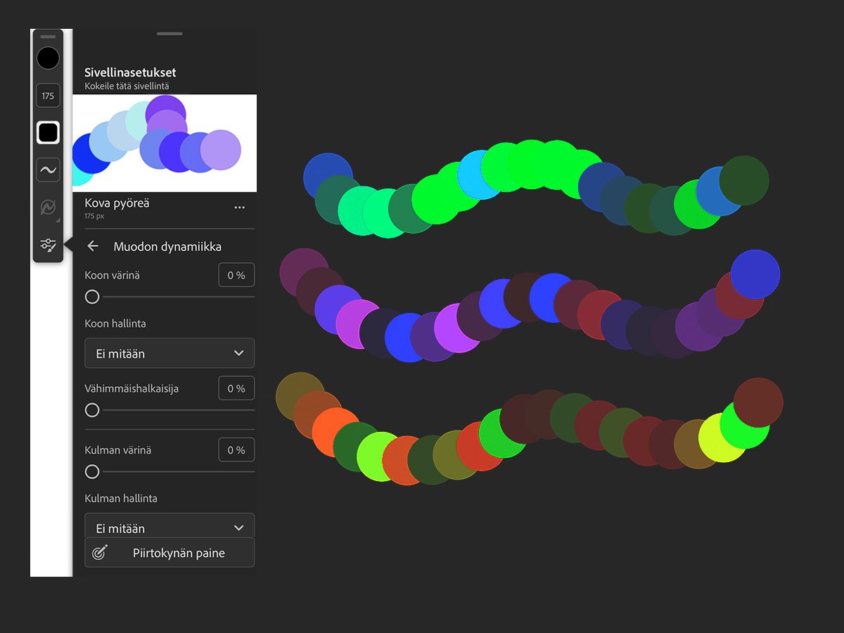 Voit muokata väridynamiikkaa napauttamalla Sivellinasetukset ja sitten Väridynamiikka valitaksesi jonkin alla olevista sivellinvaihtoehdoista: