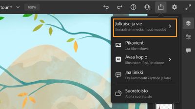 Ota selvää, miten voit jakaa Adobe Fresco ‑taideteoksesi julkaisemalla ne sekä viemällä ne eri muotoihin ja eri pinnoille.