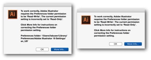 Oletusarvot-kansioon ei ole kirjoitusoikeuksia. Illustrator ei voi käynnistyä, jos Oletusarvot-kansio on vain luku -tilassa.