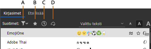 Löydät usein käyttämäsi kirjasimet nopeasti merkitsemällä yksittäisiä kirjasinperheitä tähdellä suosikeiksi tai valitsemalla niitä kirjasinluettelon alussa näkyvistä viimeksi käytetyistä kirjasimista. Viimeksi käytetyt ja tähdellä merkityt kirjasimet säilyvät InCopy-istuntojen välillä.
