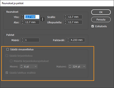 Valitse Reunukset ja palstat ‑valintaikkunasta Säädä sivuasettelua. Tämä valintaruutu ei oletusarvoisesti ole valittuna.