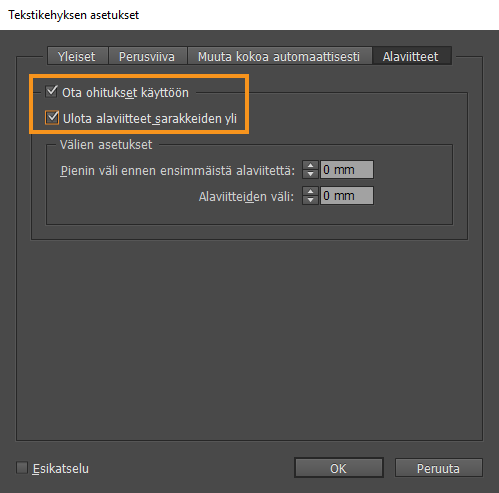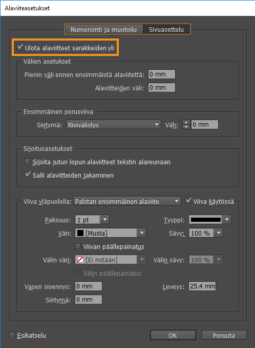 Valitse Ota ohitukset käyttöön ja Ulota alaviitteet sarakkeiden yli.