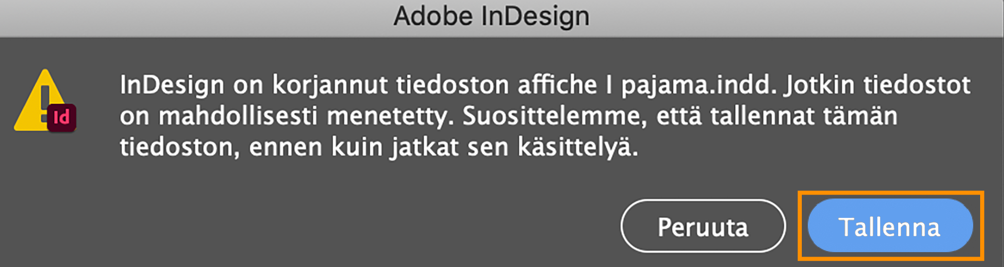 InDesignissa on automaattinen korjausmekanismi, joka tunnistaa vioittuneen julkaisun ja palauttaa sen automaattisesti. Julkaisun palautettu versio avautuu InDesignissa, ja sinua kehotetaan tallentamaan julkaisu, ennen kuin jatkat.