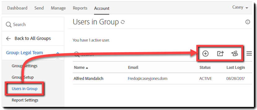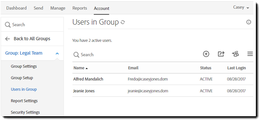 Business- ja Enterprise-tason Adobe Acrobat Sign -tileillä on pääsy Ryhmä-toimintoon. Ryhmät mahdollistavat erillisten käyttäjien osajoukkojen luomisen. Niille voidaan antaa oikeus eri kirjastodokumentteihin ja asetuksiin (kuten logoihin ja Cc-kopioiden vastaanottajiin).