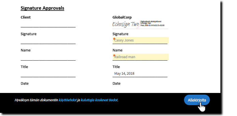 Kun dokumentti on avattu, allekirjoittaja voi lukea dokumentin ja täyttää kaikki tarvittavat kentät. Kaikki pakolliset kentät on täytettävä, ennen kuin allekirjoittaja voi jatkaa allekirjoitusprosessia.
