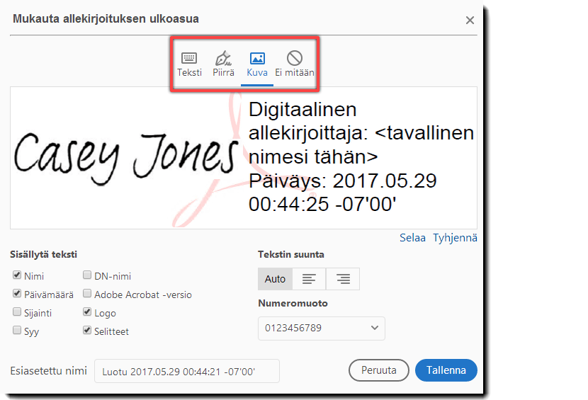 Huomaa, että Mukauta-paneelin yläosassa on samat allekirjoitusvaihtoehdot kuin sovelluksessa. Voit halutessasi vaihtaa oletuskirjasimen piirretyksi allekirjoitukseksi tai kuvaksi.