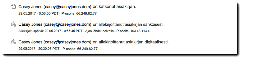 Alla olevassa esimerkissä näet, että ensimmäisellä allekirjoittajalla on yksi ”sähköisesti allekirjoitettu” tapahtuma, siinä kaikki.