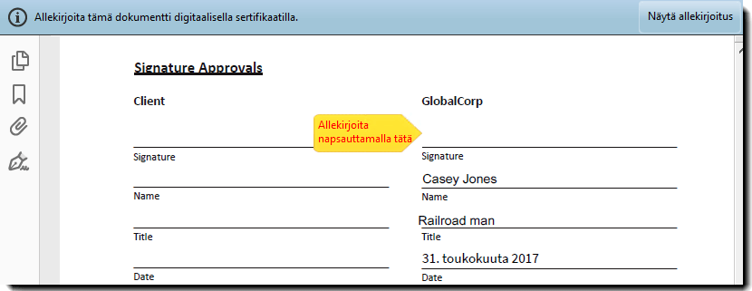 Paikka, jota on napsautettava ja jonne allekirjoitus on lisättävä, on osoitettu keltaisella välilehdellä.