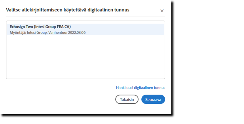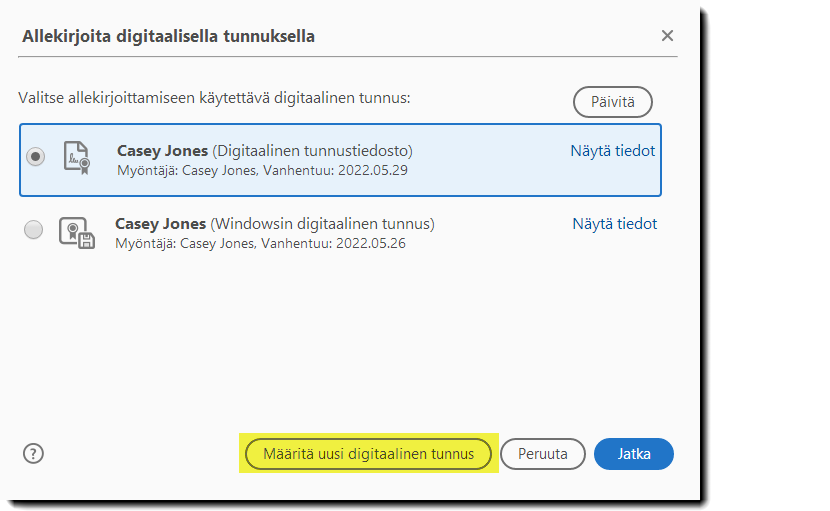 Valitse käytettävä digitaalinen tunnus ja napsauta Jatka-painiketta.
