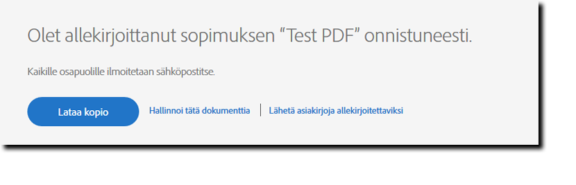 Kun toisen tekijän todennus on suoritettu, dokumentti allekirjoitetaan, ja näyttöön tulee onnistumisviesti.