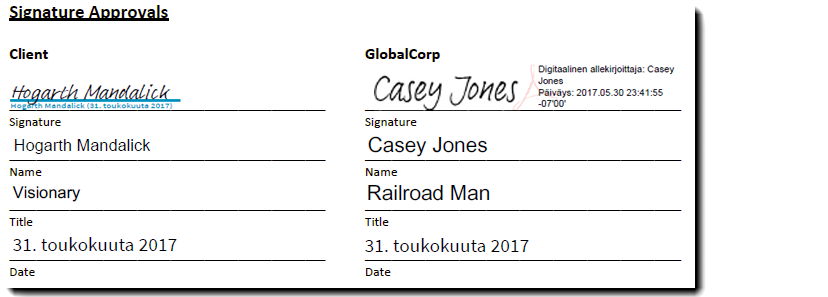 Huomaa, että vaikka yksi allekirjoittaja käyttäisi digitaalista allekirjoitusta, muiden allekirjoittajien ei tarvitse tehdä niin. On täysin sallittua, että digitaalisia allekirjoituksia käyttävät vain sisäiset allekirjoittajat, kun taas ulkoiset allekirjoittajat käyttävät sähköistä allekirjoituskenttää (tai toisin päin).