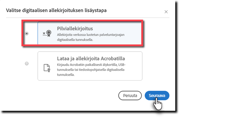 Kenttää napsautettaessa näyttöön avautuu peittokuva, jossa allekirjoittajaa pyydetään valitsemaan yksi kahdesta polusta: