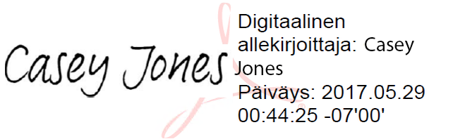 Alla on esimerkki normaalista sähköisestä allekirjoituskentästä vasemmalla ja digitaalisesta allekirjoituksesta oikealla.