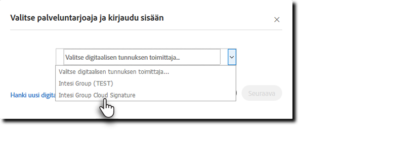 Näyttöön tulee uusi peittokuva, jossa allekirjoittajaa pyydetään valitsemaan tunnistetietojen toimittaja avattavasta valikosta.