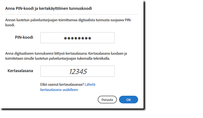 Esimerkki: alla oleva palveluntarjoaja edellyttää pysyvää PIN-koodia, joka luodaan digitaalista tunnusta määritettäessä, ja kertasalasanaa.