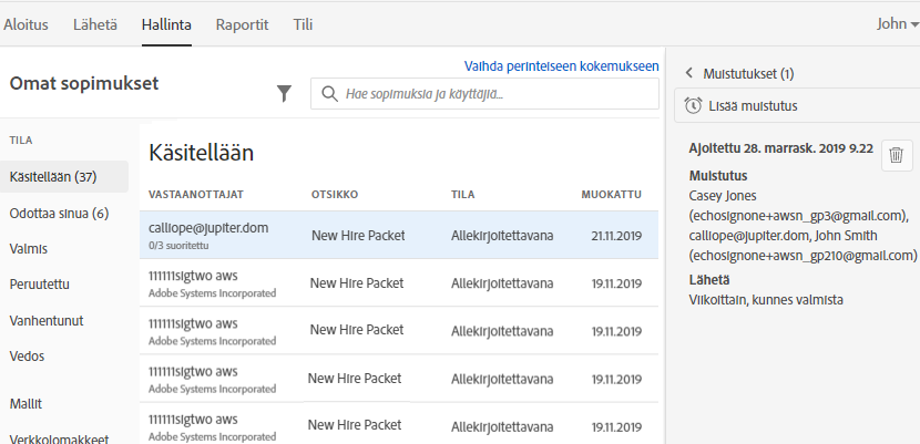 - Nykyisen allekirjoittajan korvaaminen Hallinta-sivun kautta ei nollaa muistutuksen ajastinta.