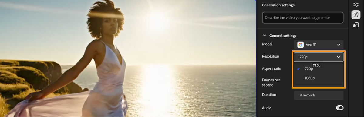 Firefly video editor offers various Google Veo model options such as Veo 2, Veo 3.1, and Veo 3.1 Fast. Each is designed to deliver high-quality results, enhanced visual fidelity, and rapid iterations.