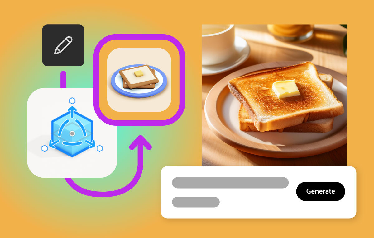 Generate or upload images, then use Firefly to add, remove, or transform objects and backgrounds until they match your vision.
