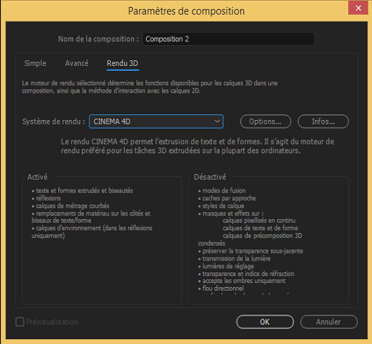 Lorsque vous sélectionnez CINEMA 4D dans la liste déroulante Système de rendu, la colonne « Activé » affiche les options 3D qui sont activées, tandis que la colonne « Désactivé » affiche les options 3D qui ne sont pas disponibles.