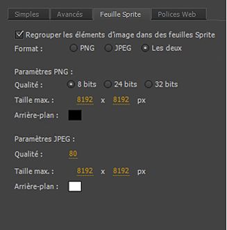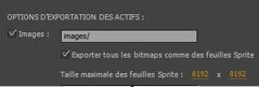 - Exportation de bitmaps comme une feuille Sprite à l’aide des options de l’onglet Feuille Sprite dans les Paramètres de publication.
