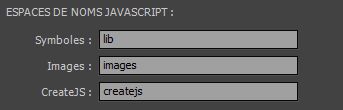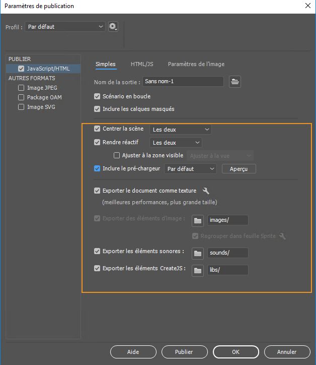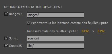 - En spécifiant de ne pas exporter les éléments du fichier FLA en désélectionnant les options d’exportation des actifs pour les images et les sons, en prenant en charge les bibliothèques JavaScript CreateJS et en utilisant les URL relatives pour l’exportation.