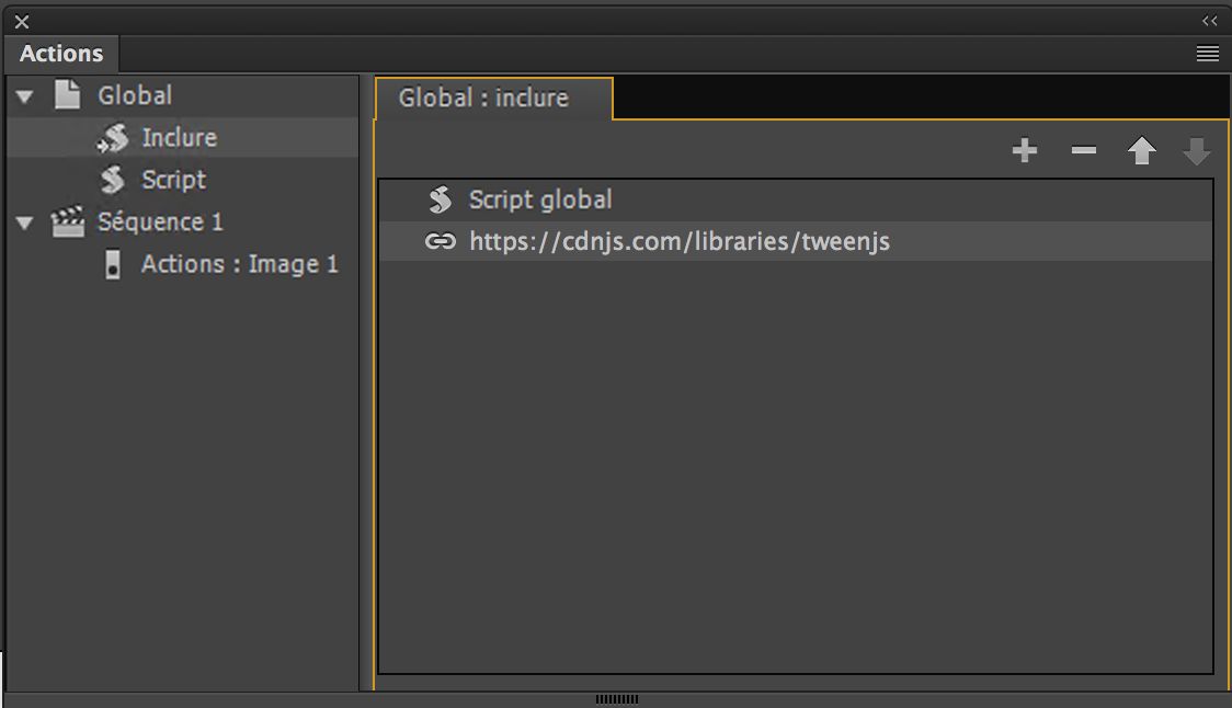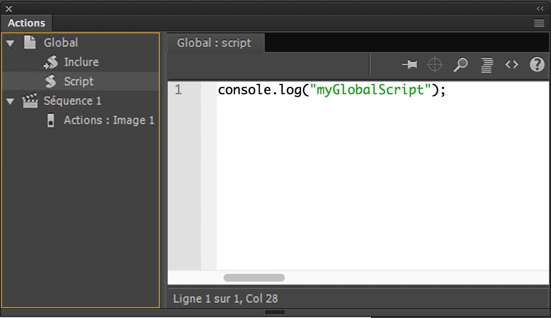 Dans la section Script global, vous pouvez rédiger des scripts applicables à plusieurs documents depuis Animate ou comme un script externe.