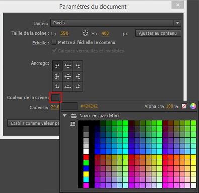 - Sélectionnez Modification > Document > Couleur de la scène ou dans l’Inspecteur des propriétés, sélectionnez Paramètres avancés.
