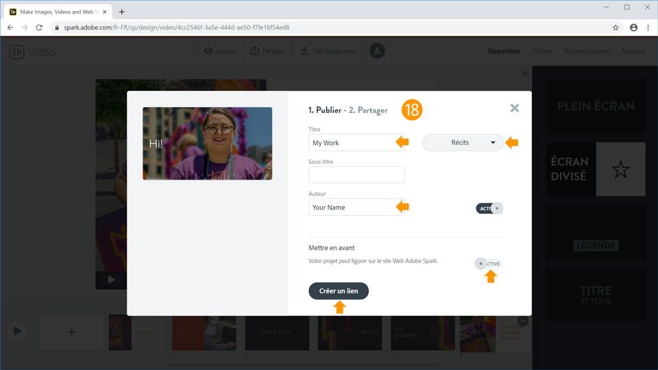 18. Cliquez sur le bouton Partager > Publier dans le menu supérieur, choisissez une catégorie, spécifiez un titre, puis indiquez votre nom dans le champ Auteur. Désactivez l'option Mettre en avant (ou laissez-la activée si vous publiez votre propre histoire). Enfin, cliquez sur le bouton Créer un lien pour publier la vidéo. Vous pouvez à présent copier et partager le lien public de votre vidéo, ou choisir une autre option de partage parmi celles proposées.