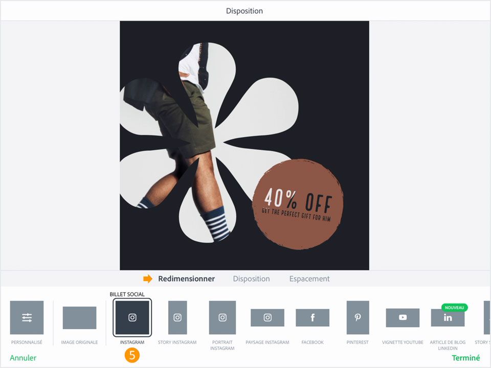5. Appuyez successivement sur Disposition et Redimensionner, puis sélectionnez le format du réseau social sur lequel vous souhaitez publier votre création. Dans notre exemple, nous avons choisi INSTAGRAM de la catégorie BILLET SOCIAL. Adobe Spark Post redimensionne automatiquement la mise en page pour le réseau social sélectionné. Appuyez sur Terminé.